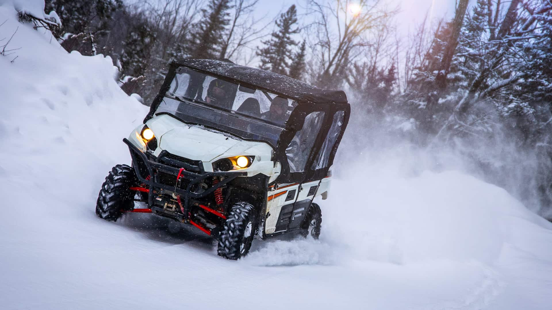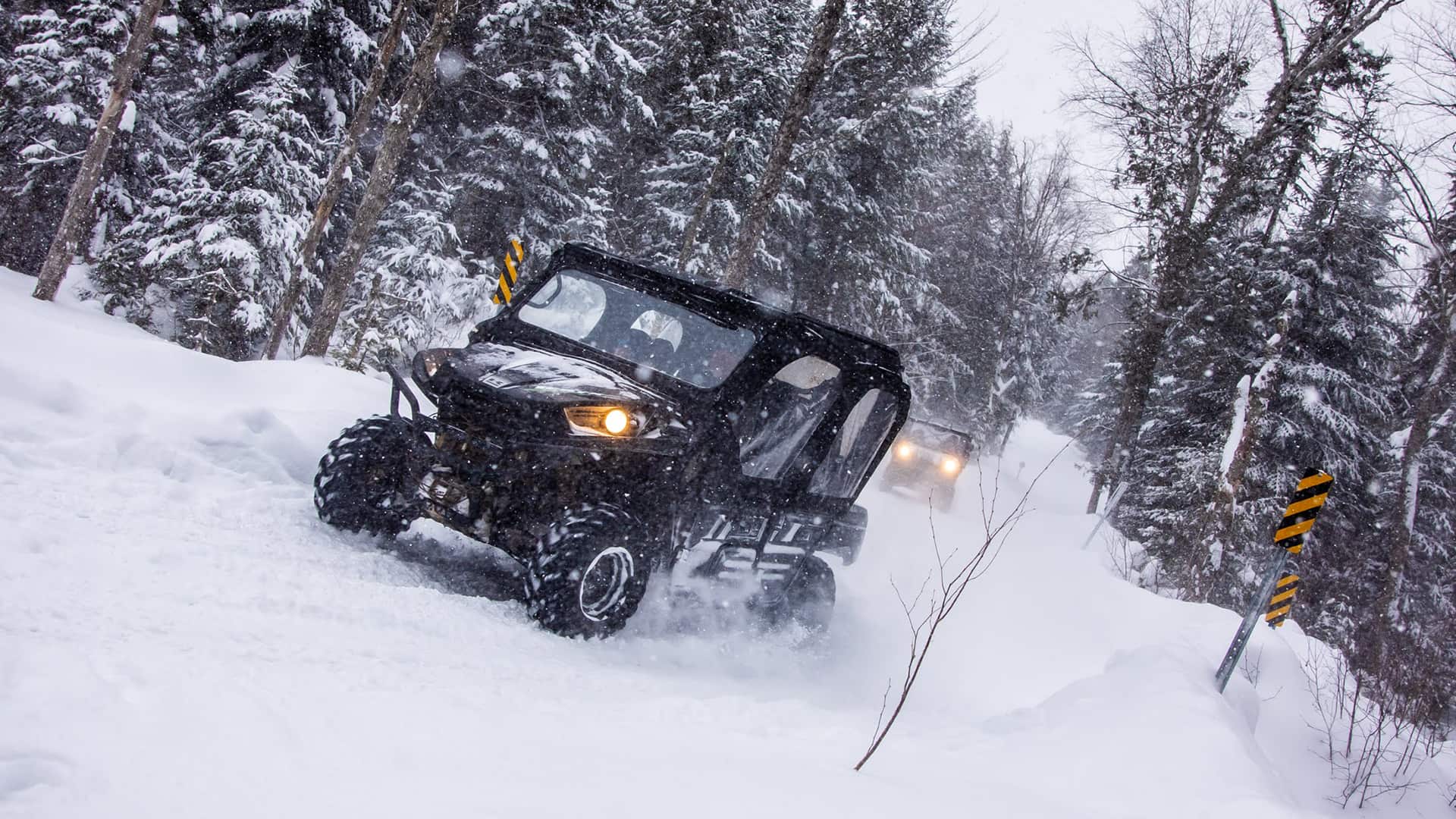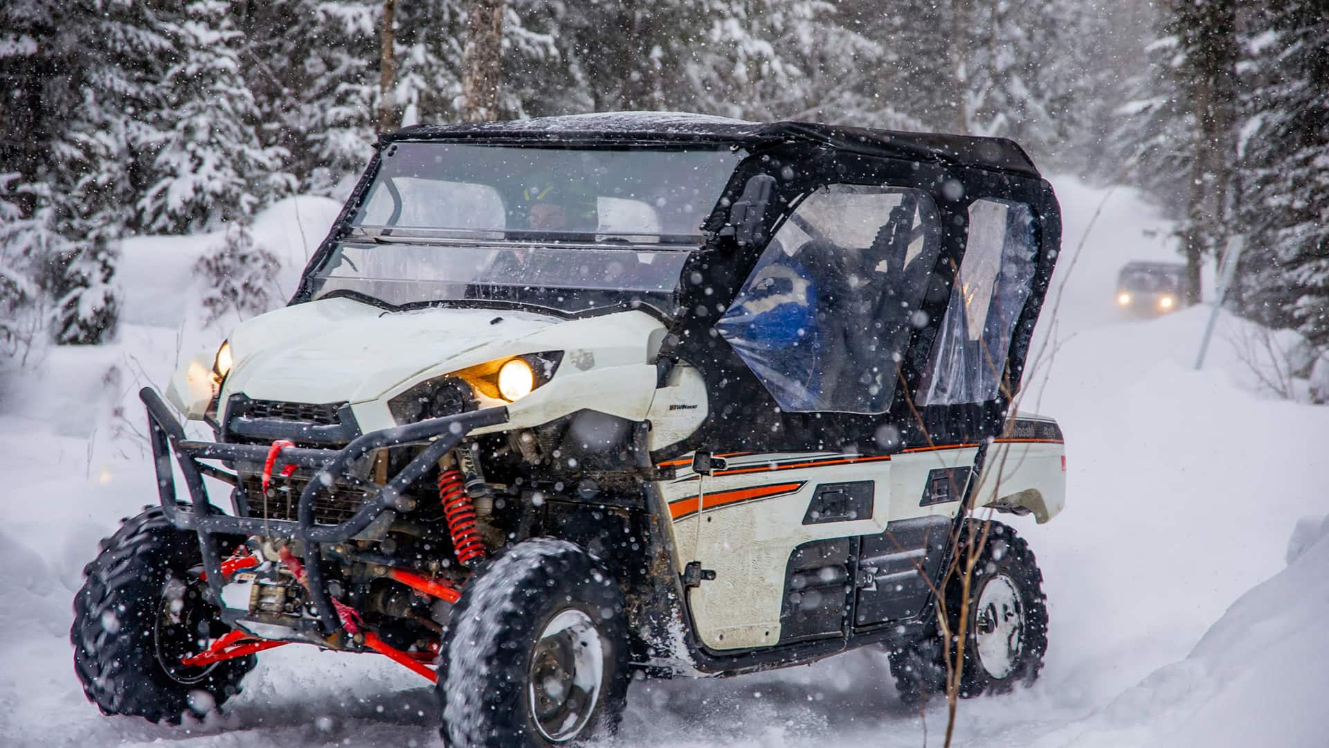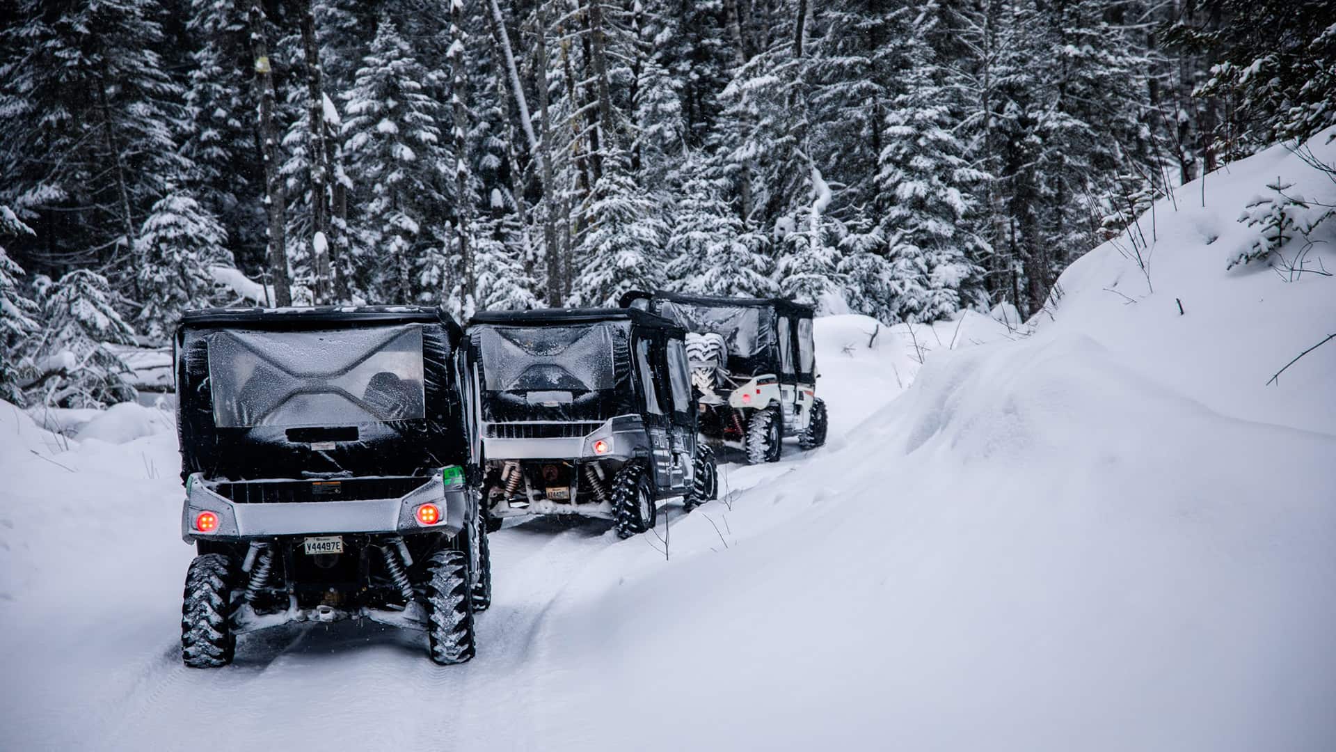 We operate year-round with different seasonal experiences. In summer and fall, the trails are forest paths with dirt, mud, and rock surfaces. In winter, you’ll drive through snow-covered trails and frozen landscapes. Our tours pause for a few weeks during spring and fall transition periods to protect the trails during seasonal thaw.