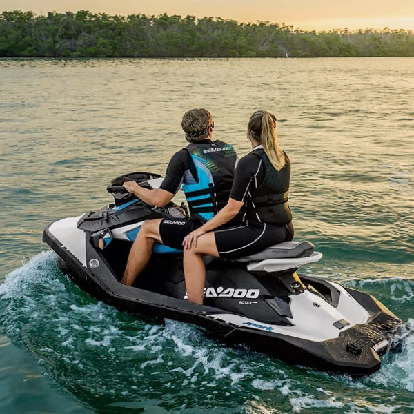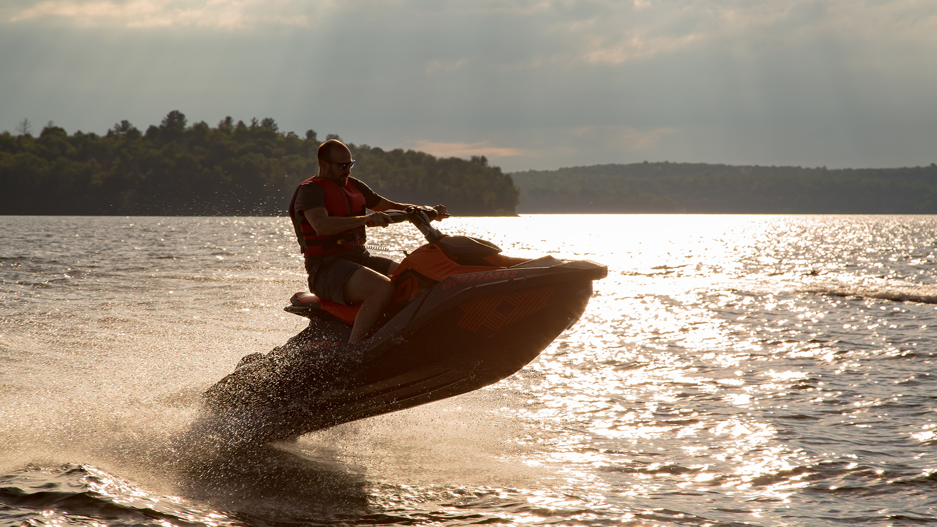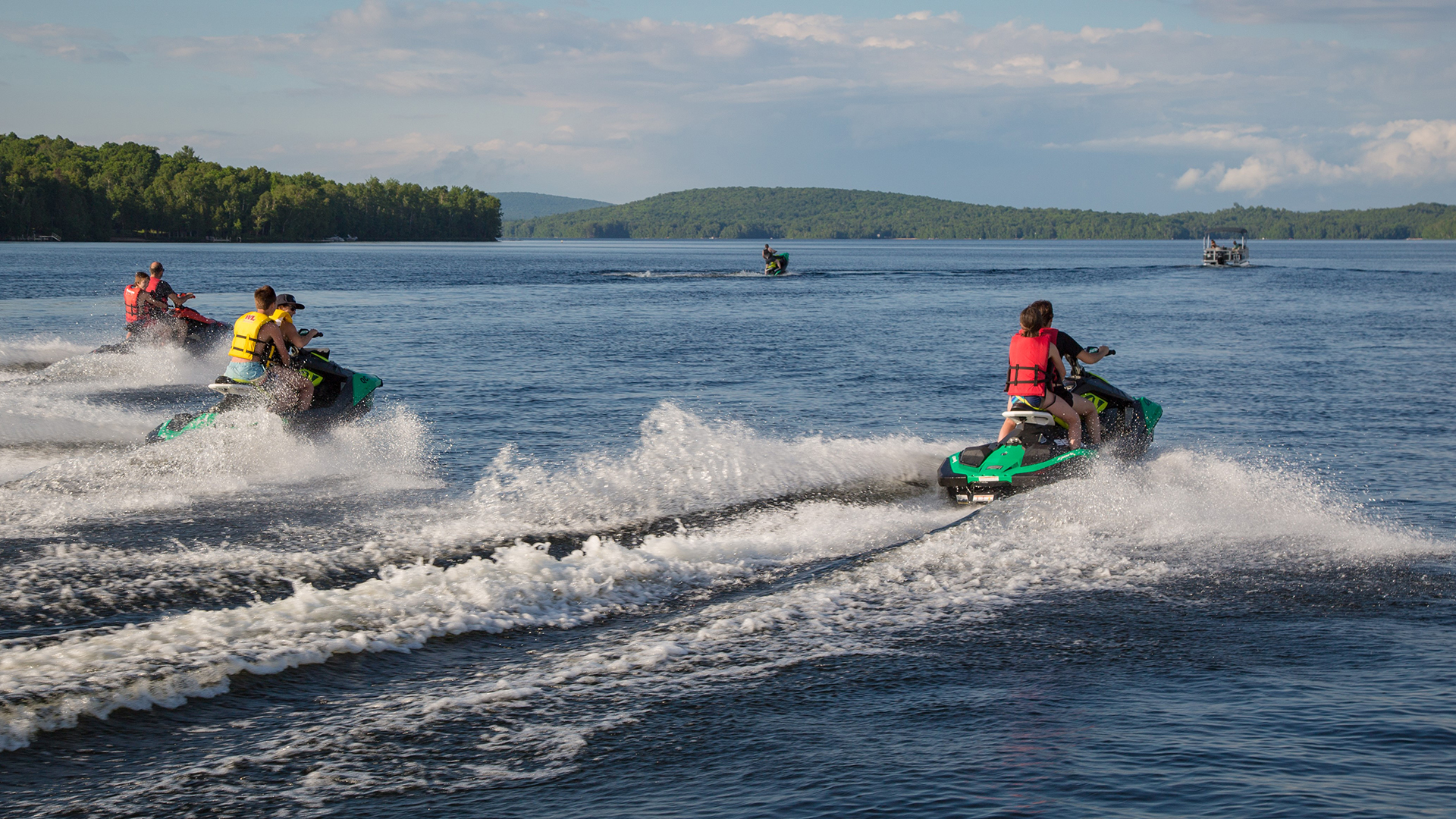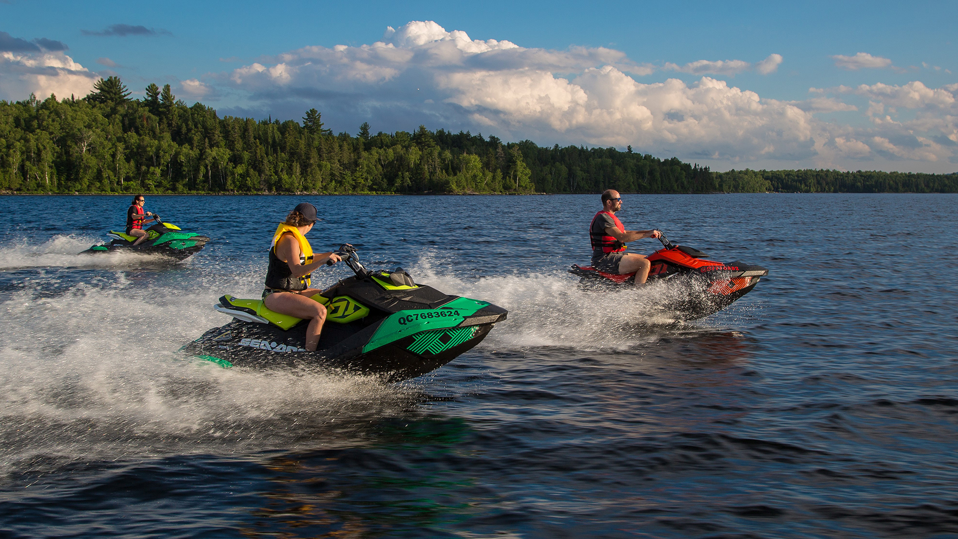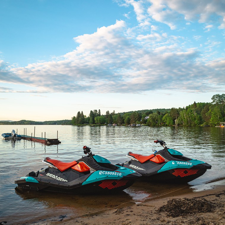 We offer brand new, light weight and easy to manipulate jet skis for rent that seat two people. Equipped with a 900 cc Rotax 4-stroke engine and an Intelligent Brake and Reverse (iBR) system, our Sea Doo Spark personal watercraft (PWC) are designed so that even beginners can handle them and, with some practice, do tricks on the water. You can stand or sit, and ride alone or with a passenger as you discover this exciting sport on our 9 km long lake.