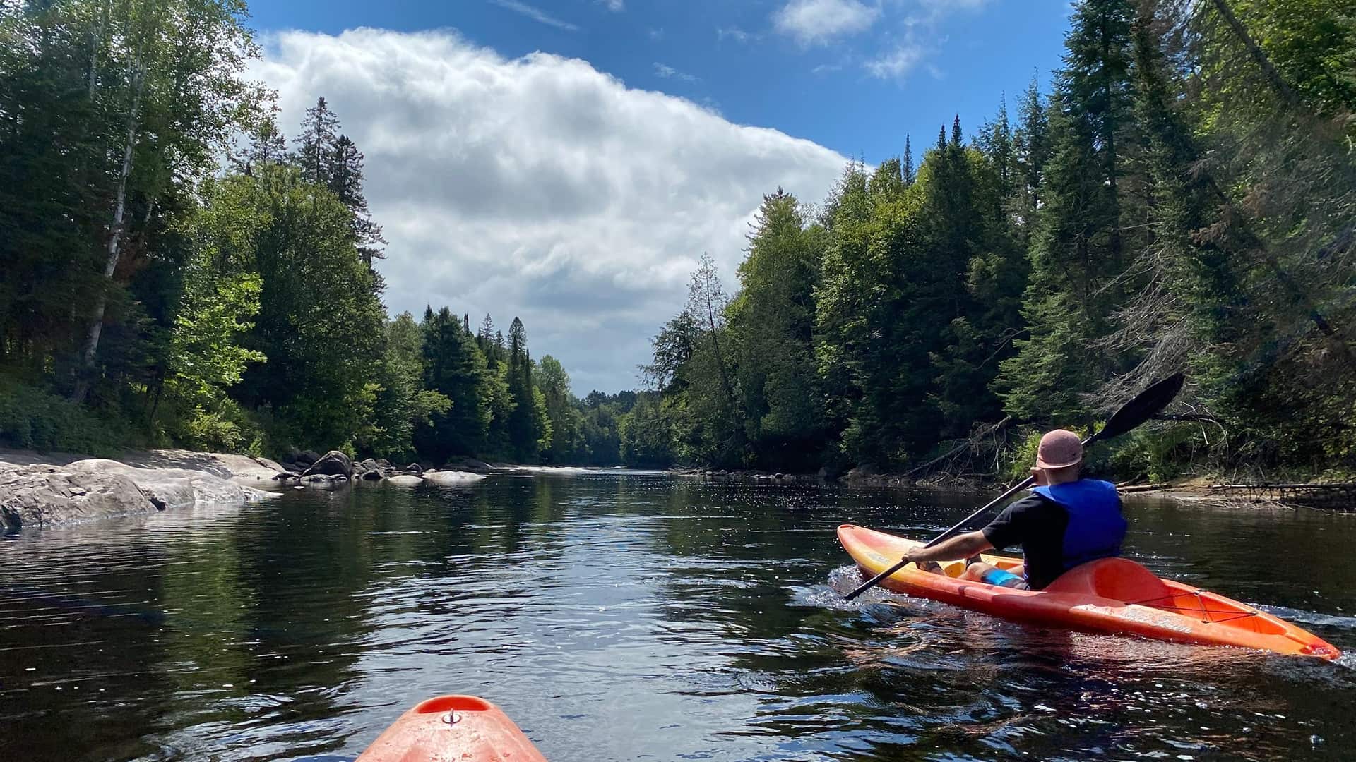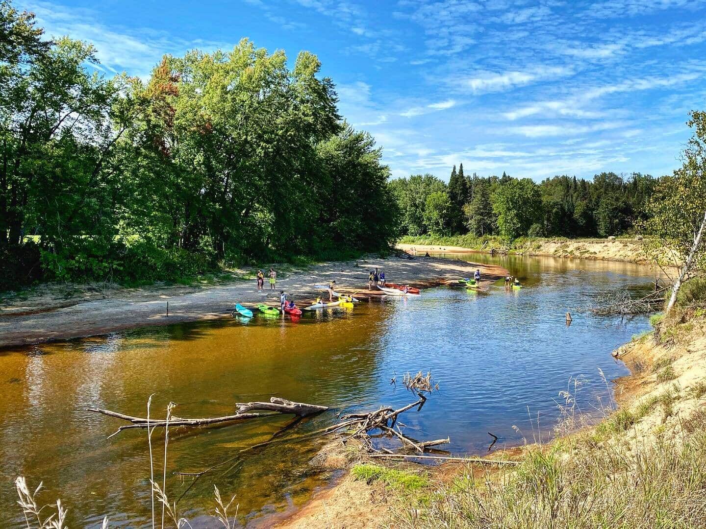 Our self-guided kayaking activity begins at our dock on the Rivière du Diable, after a short 5-minute walk along our trails, and ends 5 km further, at the meeting point for the return shuttle which picks you up 2 hours after your departure. It gives you plenty of time to enjoy the river and its beaches since the route can be completed in less than 1 hour 30 minutes if you paddle non-stop.