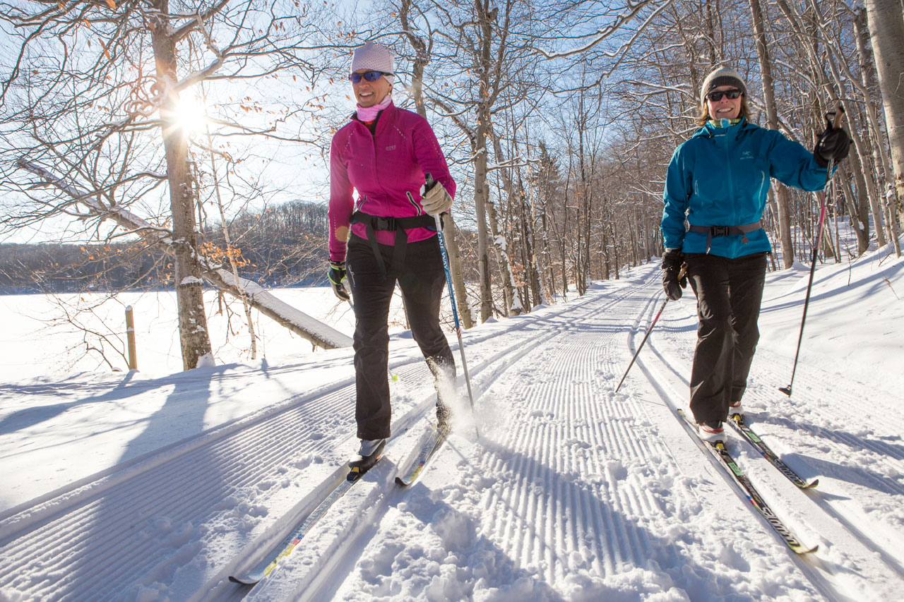Our cross-country ski daily pass gives you access to the entire network. Glide over 50 km of mechanically groomed cross-country ski trails, bordered by pine forests and frozen rivers in Mont-Tremblant National Park. This is an active way to discover the region’s landscapes. A nature interpretation centre, featuring a café, souvenir shop, and washrooms, is located on the southeast shore of Lake Monroe, near the parking lot.