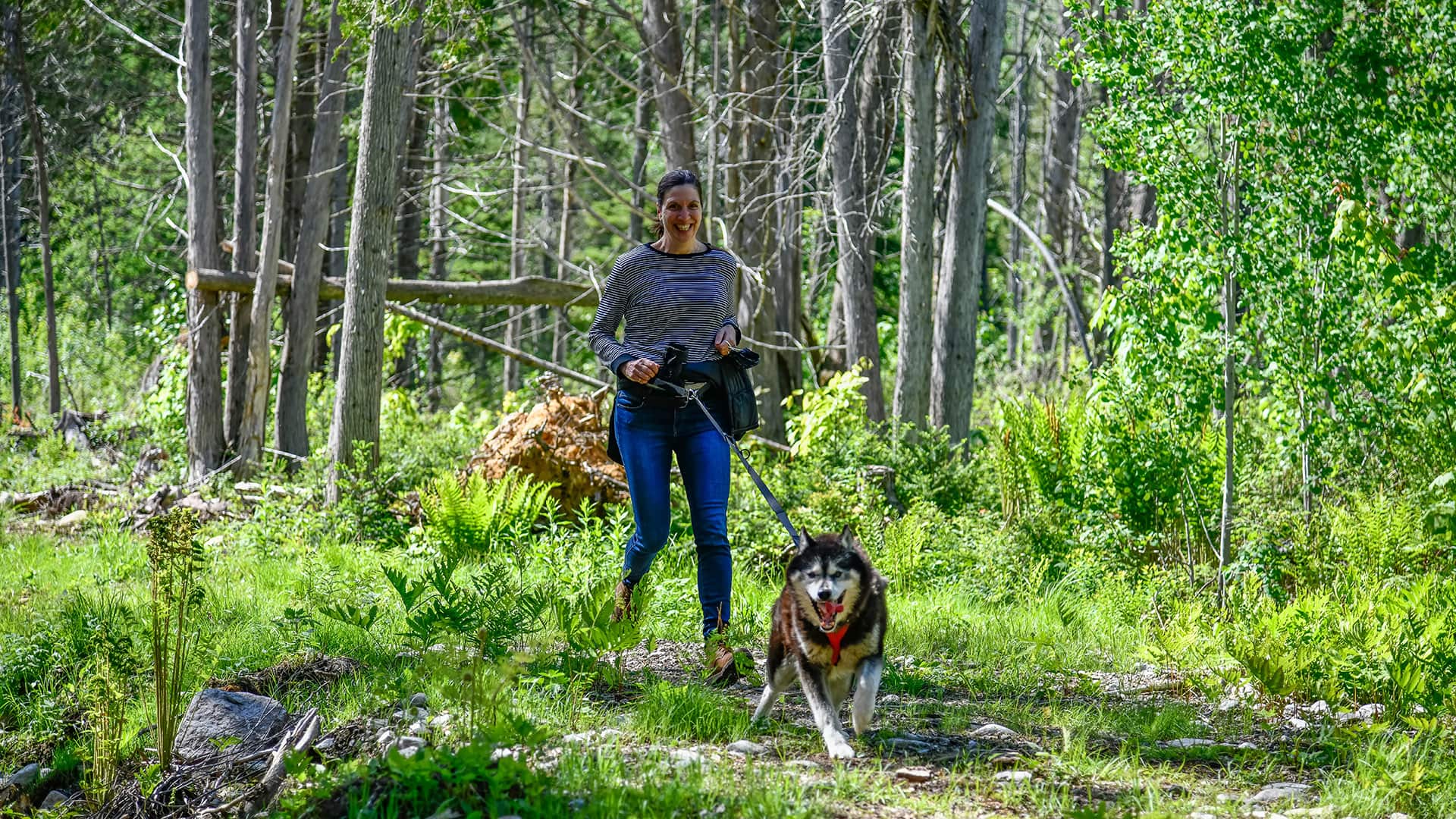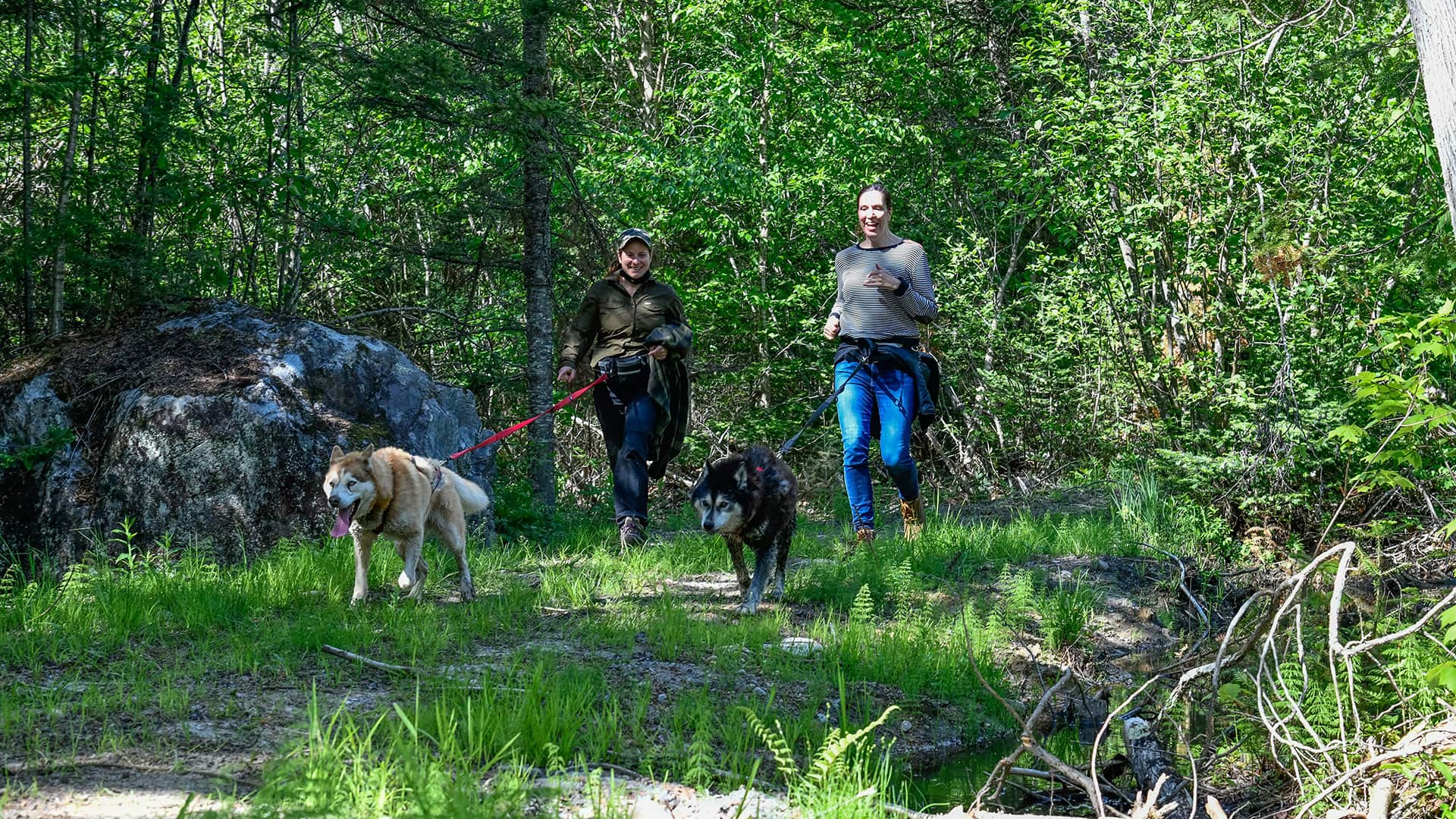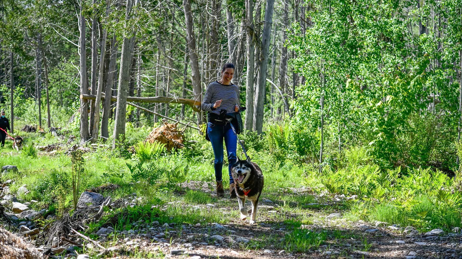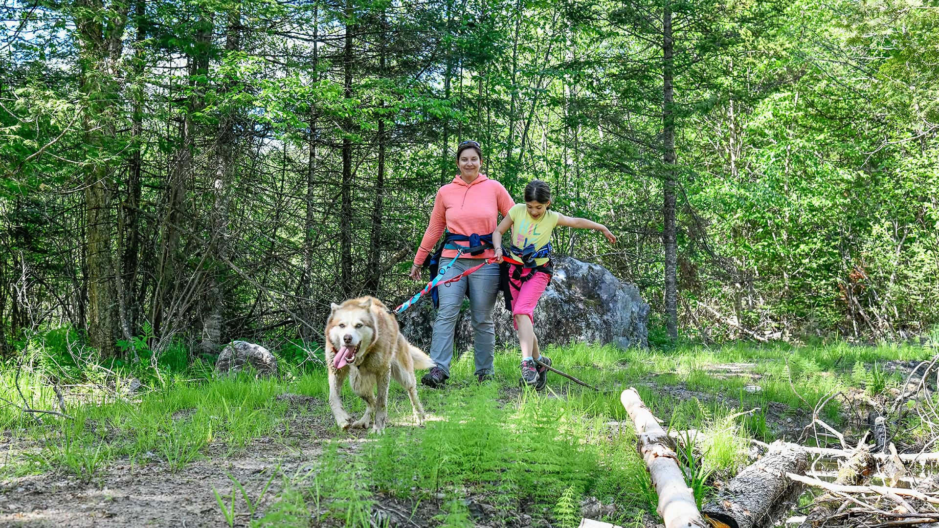 Our Mont-Tremblant Sled Dog Hiking (cani-hiking) is hiking with a dog walking in front, attached to a waist belt and a long leash. Our adventure is private for you and your group and combines a visit to the pack and a hike in the woods. It’s an easy-intermediate outdoor sport to do with a dog on our nature trails.
