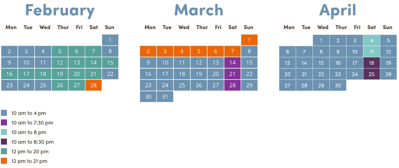 • Lumagica Lighted walk is offered on Thursday, Friday, and Saturday evenings from December 12 to March 7, plus on holiday evenings (December 22, 23, 24, 26, 27, 28, 29, 30, 31, and January 2, 3, 4) + school break evenings (February 15, 16, 17, 18, and March 1, 2, 3, 4).