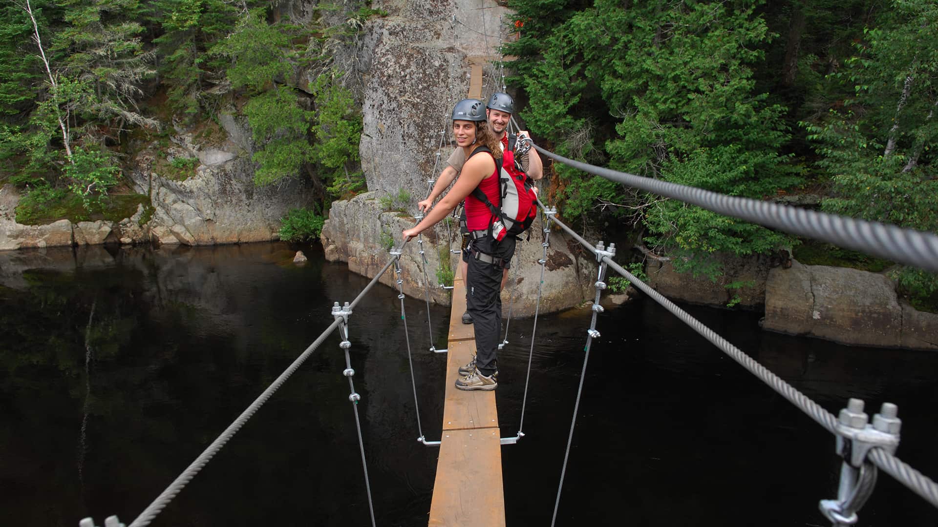 Located in Mont-Tremblant park, our Via Ferrata Laurentides in Mont-Tremblant promises to be full of surprises! No rock climbing experience is necessary to experience our Via ferrata in Laurentides. A brief course will help you learn the basics of via ferrata before tackling the trail. Clipped into a steel cable that runs the length of the cliff, you will cross a challenging face with built-in steps, handles, beams and various types of bridges while overlooking the meandering Diable River far below. Expect some physical exertion.