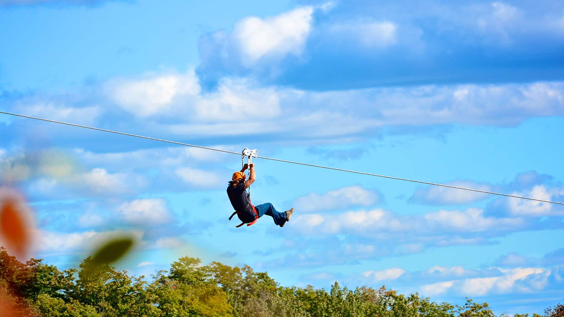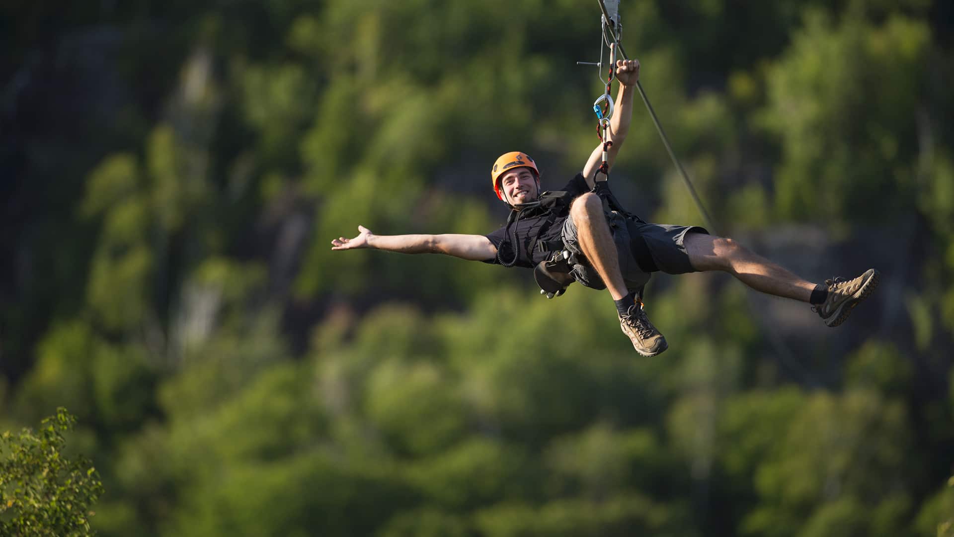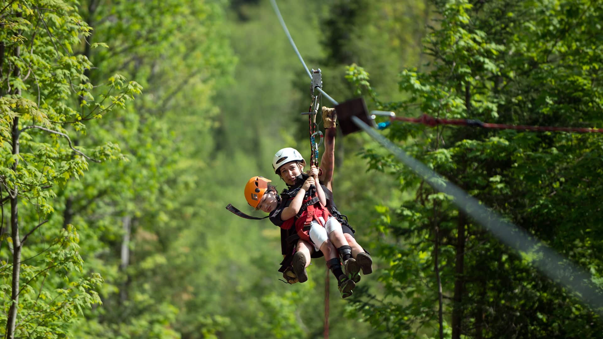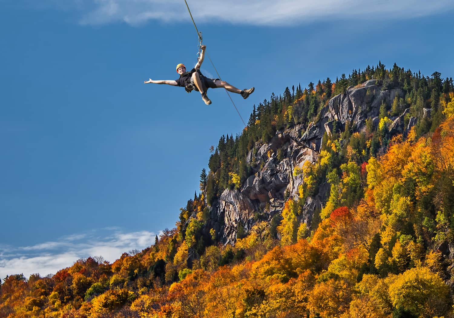 Our zipline activity at Mont-Catherine begins with an easy hike through a maple forest with rocky cliffs and views of the Laurentian Mountains. From the first peak, a mega zipline takes you to the other side of the mountain.